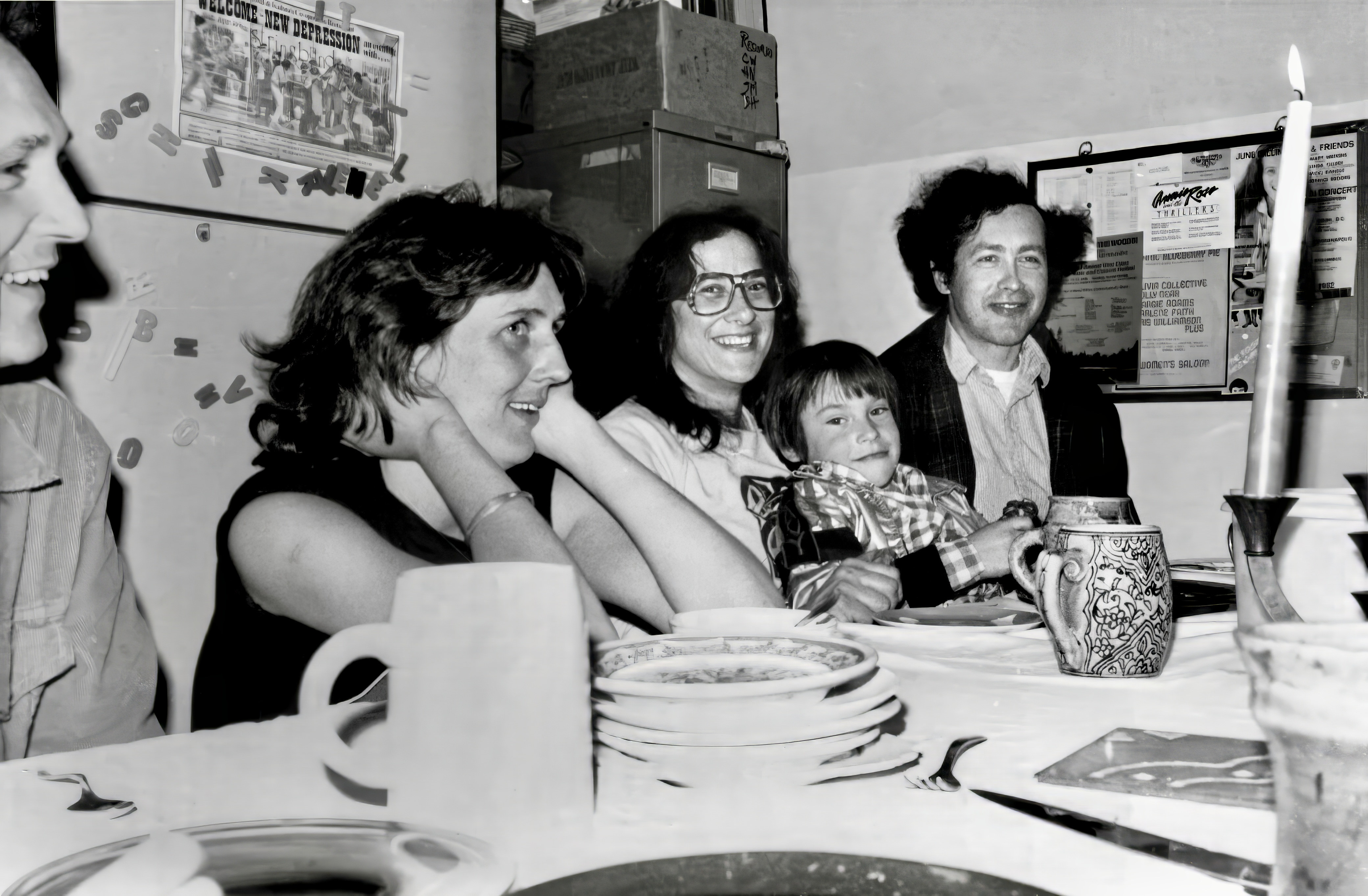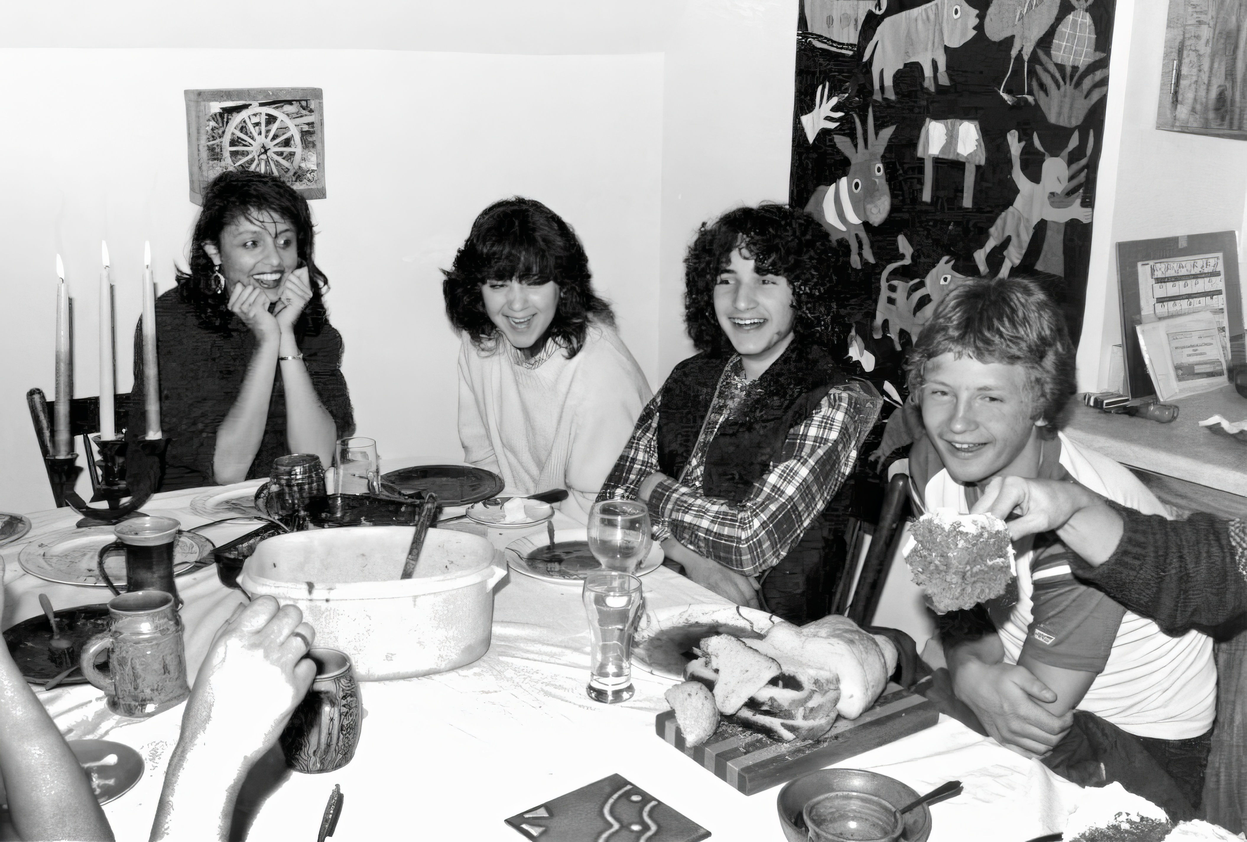 Party at Karlene’s ~ Liza, Dana, Nedjo, & Stephen (plus Karlene’s hand serving cake), early 1980s