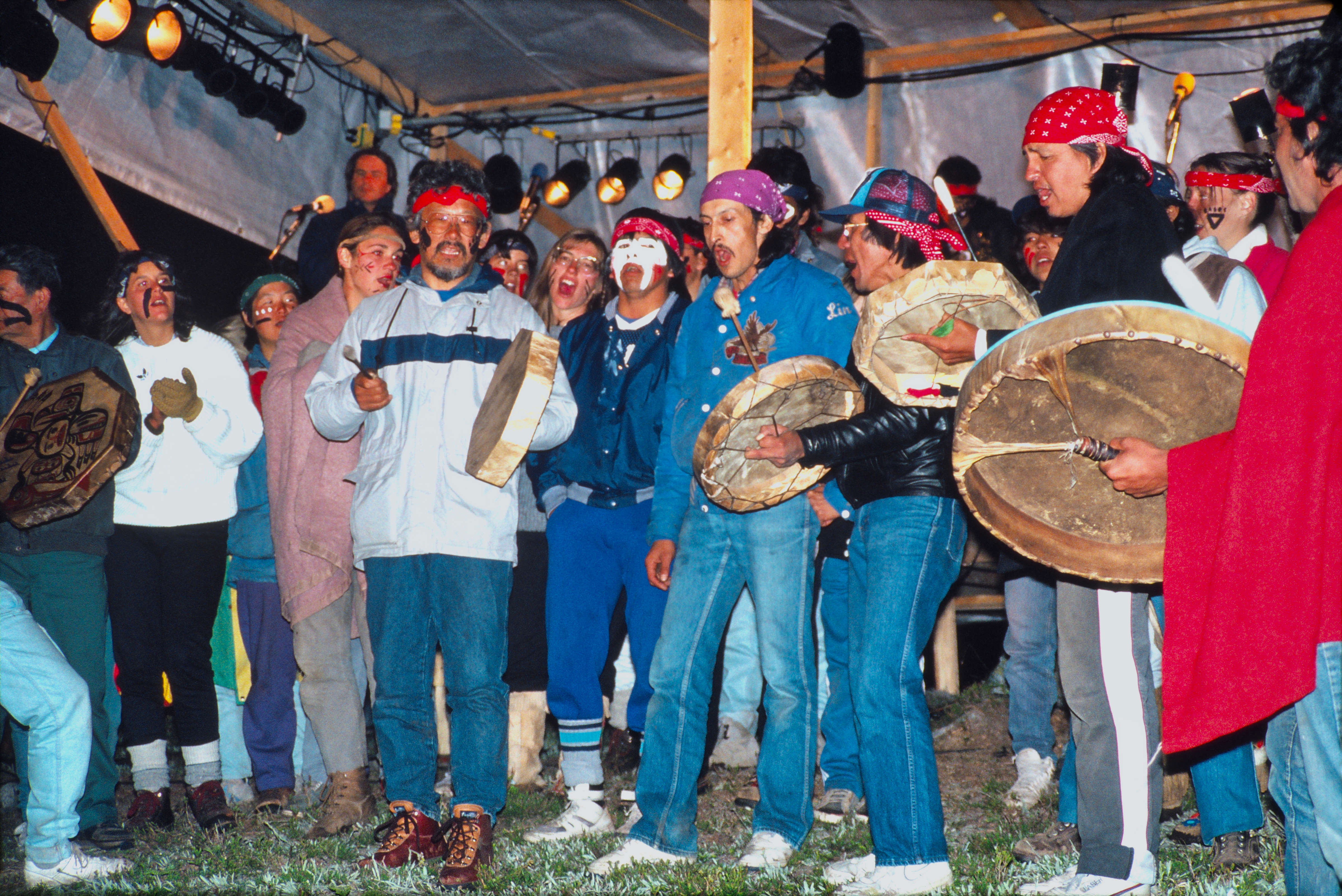Voices (and drums) for the Wilderness ~ Brimful Lake, August 2, 1987. The 2nd drummer from left is David Suzuki.