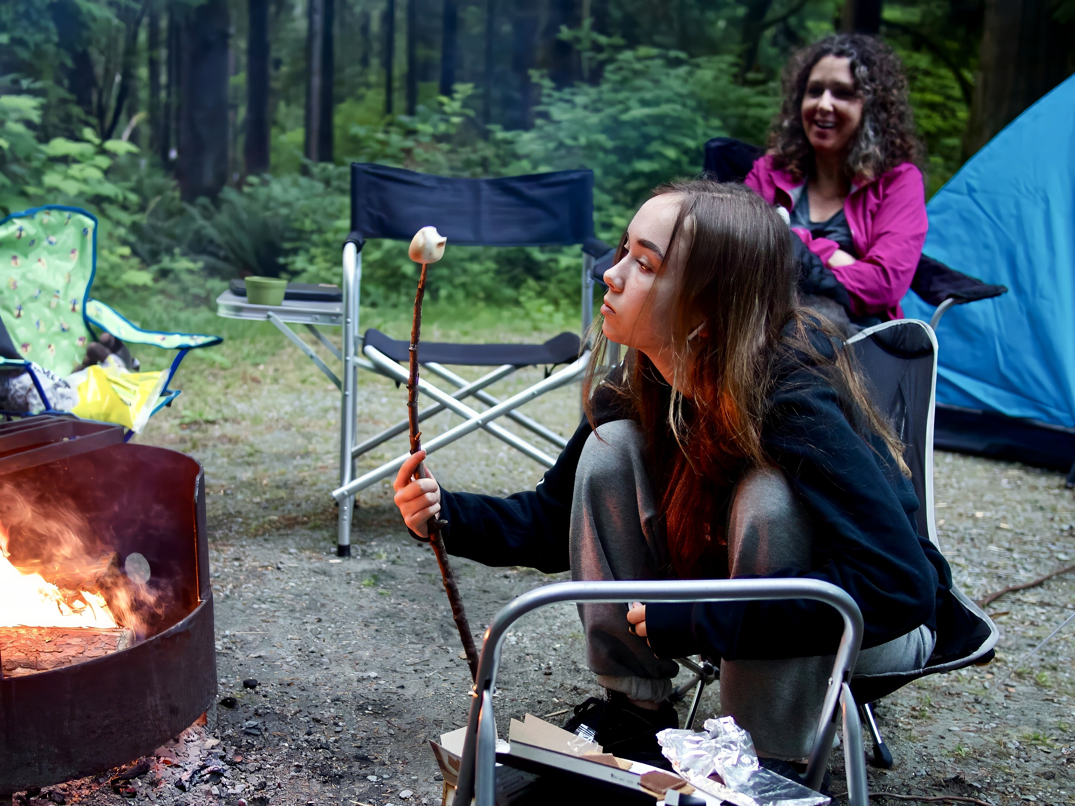 Amanda Roasting a Marshmallow (Dana in background) ~ Golden Ears Provincial Park, June 29, 2019